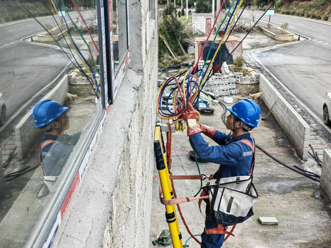 在贵州六盘水海拔2336米的梅花山,南方电网贵州电网公司六盘水钟山供电局在寒潮到来前为山区用户更换下户线,确保山区群众冬季用电安全可靠。(李泵 摄)