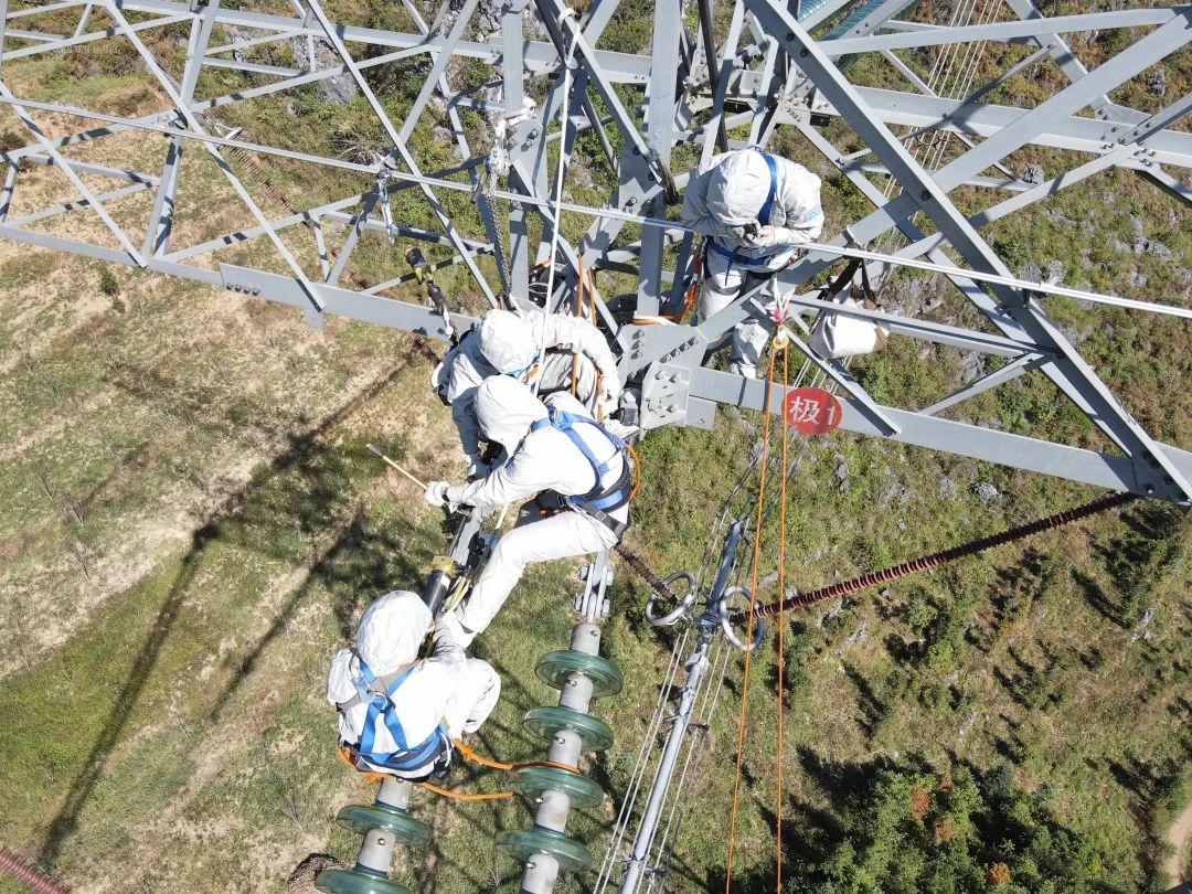 南方电网超高压公司百色局运维人员开展±800千伏普侨直流线带电安装拉力传感器作业。拉力传感器是覆冰监测终端的关键部件,可计算导线荷载值和覆冰厚度值。(胡艳伟 摄)