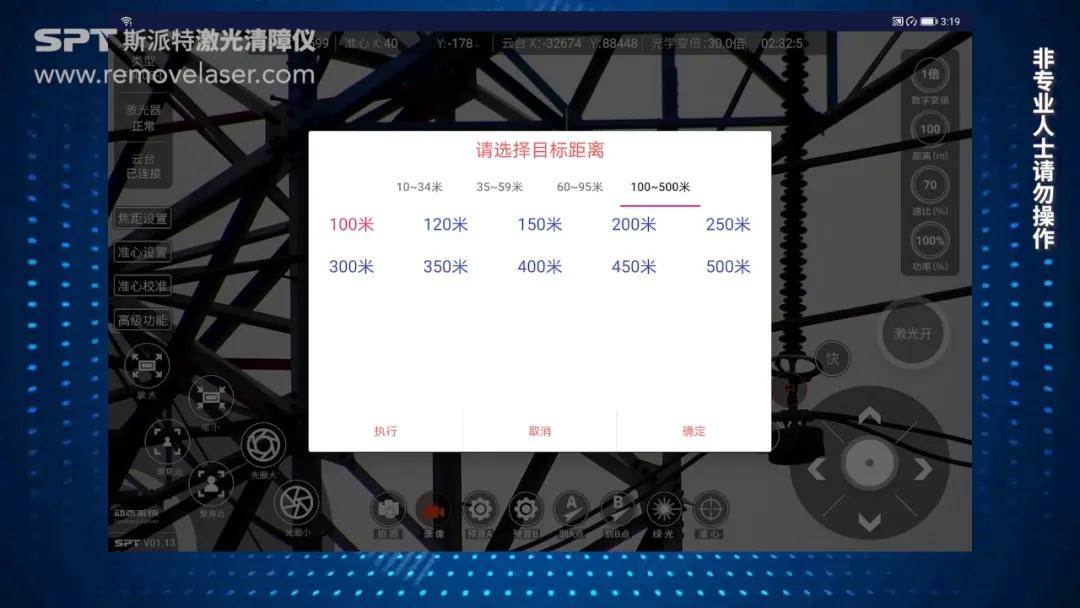 调整参数。进入“距离”菜单选择相对应目标的距离,点击“执行” 确认参数。接着打开“功率”菜单,选择合适的功率,并点击“确定”。