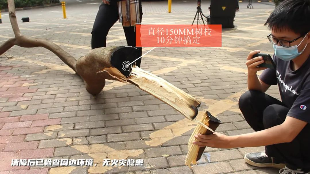但是,这次不一样了,如大家所见,采用激光清障仪对150mm的树障进行清理,仅需10分钟就可以完成,这大大地提高了作业效率;同时激光清理也无需登高的作业,提升了作业的安全性,减少了清理树障的安全风险。
